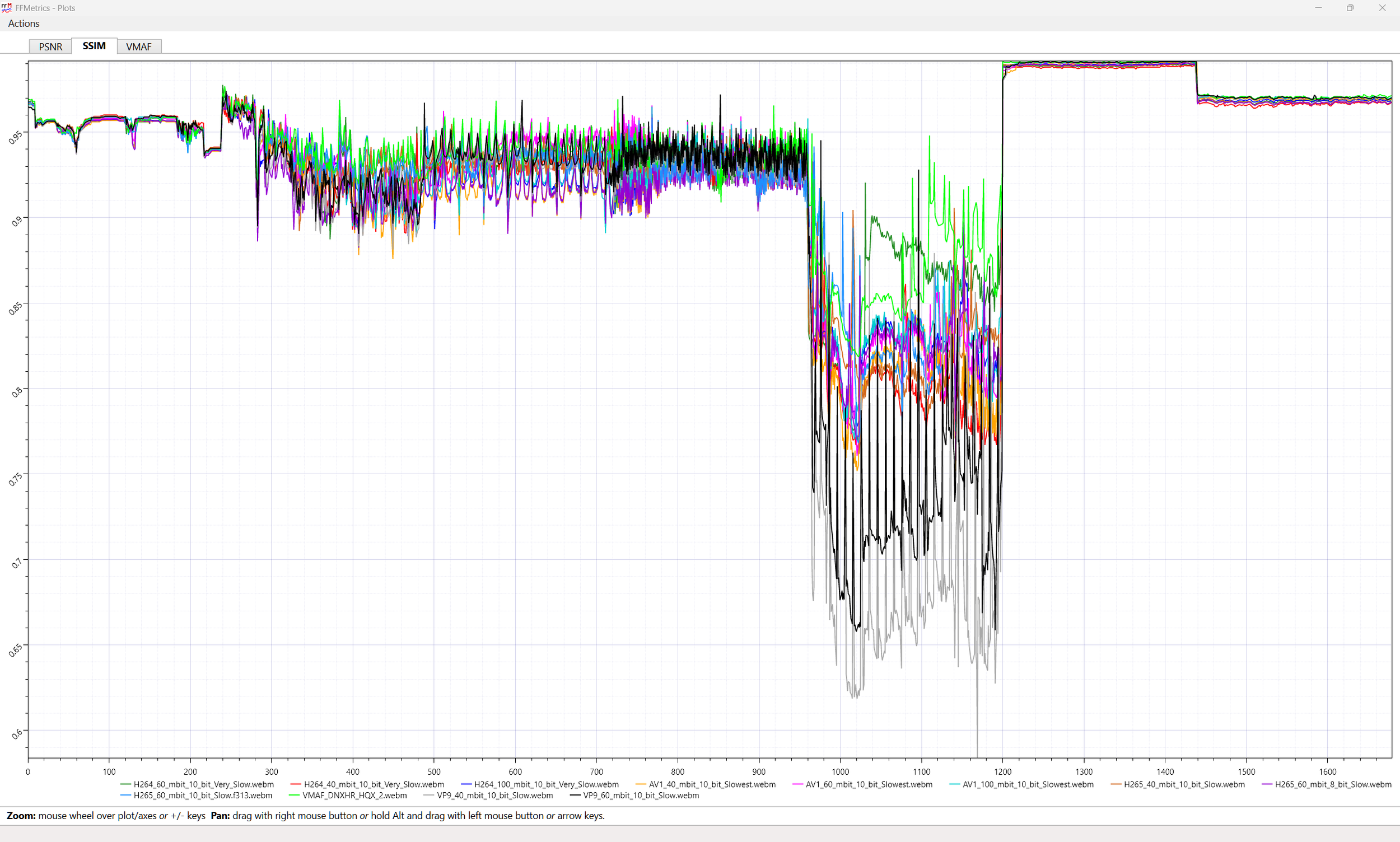 FFMetrics was run on each file vs the master to see the quality loss. The 1080/1440p files from YT were compared against their cut resolution master, not the 4k one. FFMetrics has PSNR, SSIM and VMAF, so you don't have to argue about which is best. I have included the charts, so you can see in each 10 second block what the chart looks like for the 7 different 'styles' of footage. VMAF Model 4K 0.6.1 was used