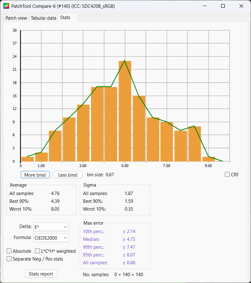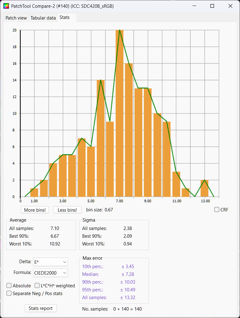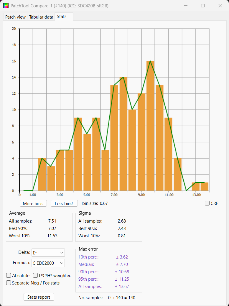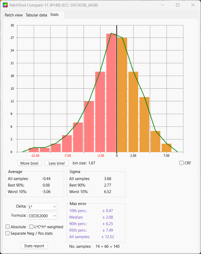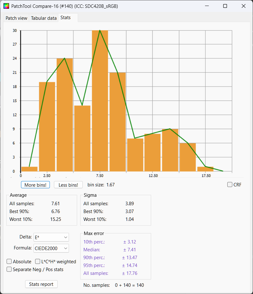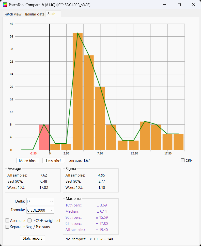 We see the whites are not nearly bright enough. Looking at Delta L chart we see again most chips are too dark and half the chips within delta L of 3.64. Mean Delta E is 7.61, median 7.41, not much better than no color management at all
