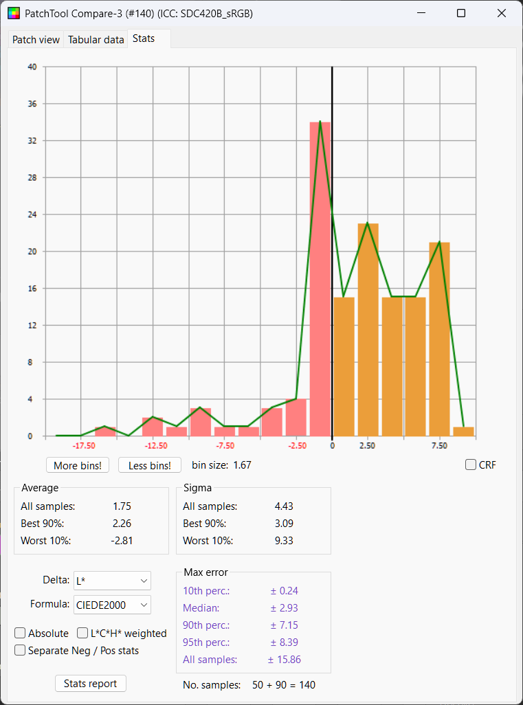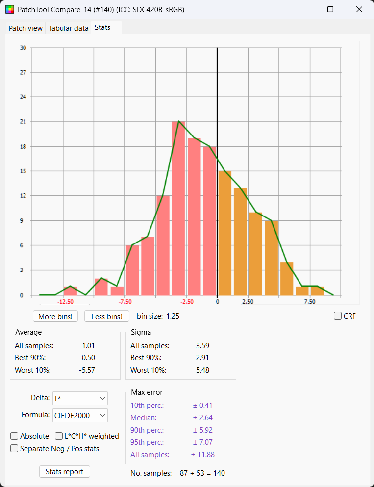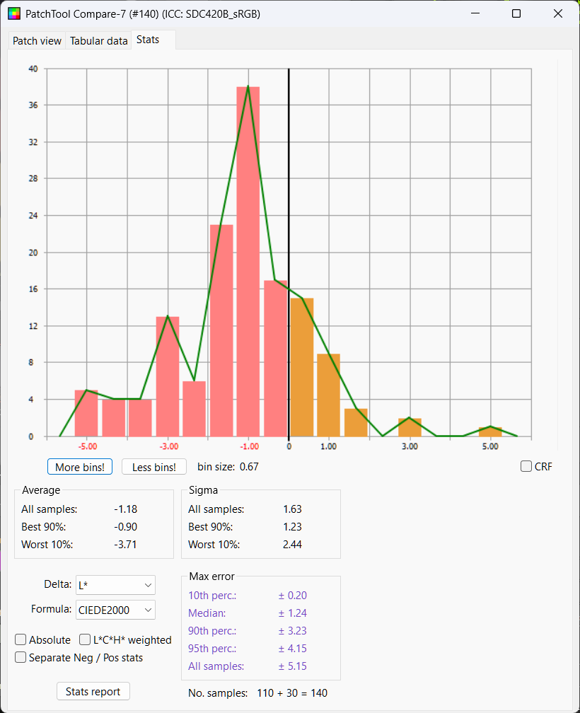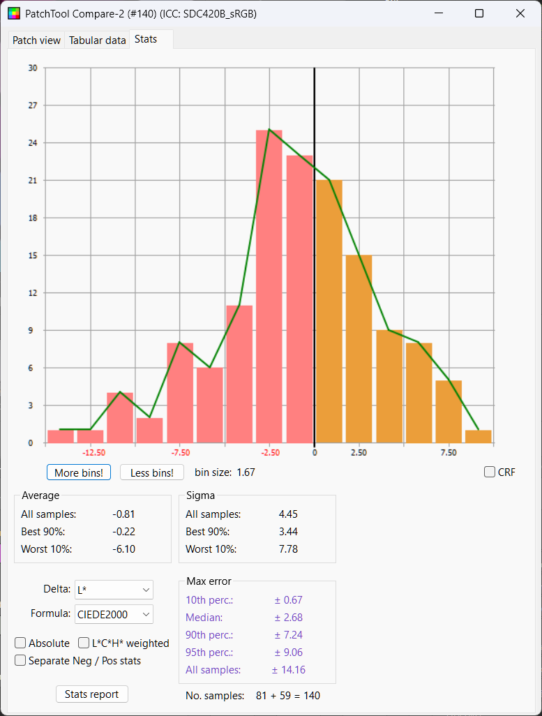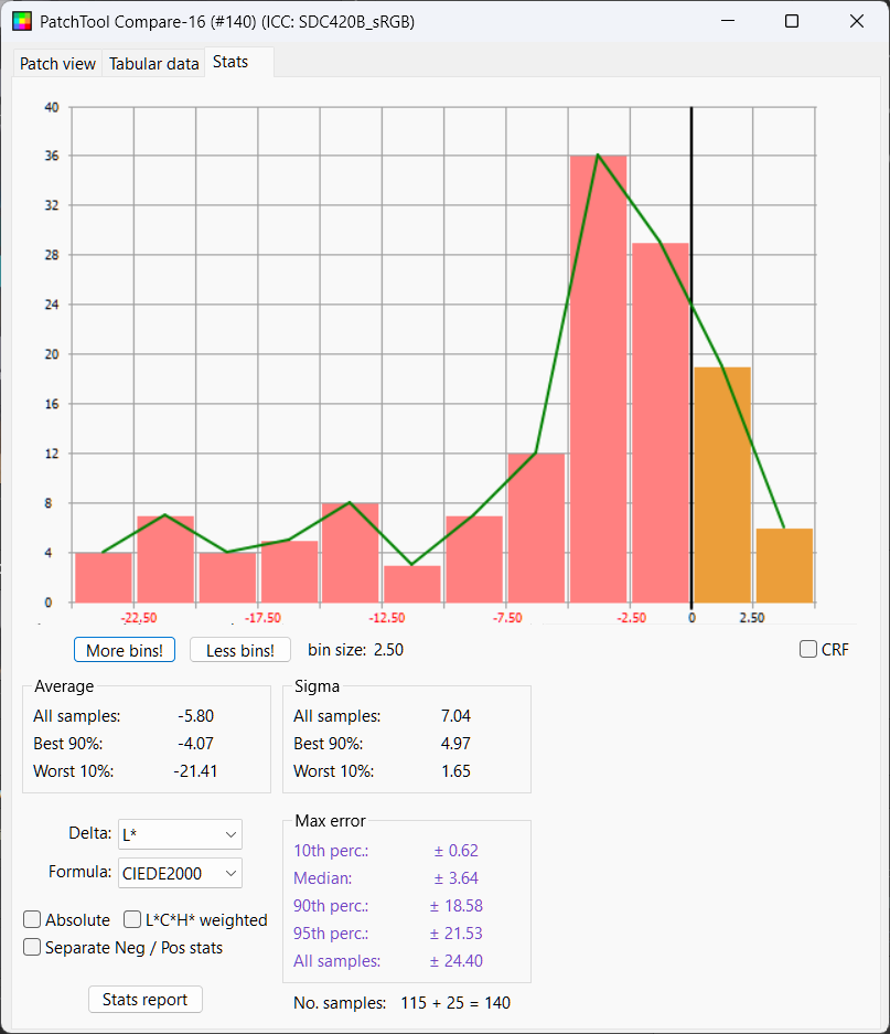 Python LUT: Delta E Mean 2.25, Median 2.15, Delta L 50%ile 0.28
