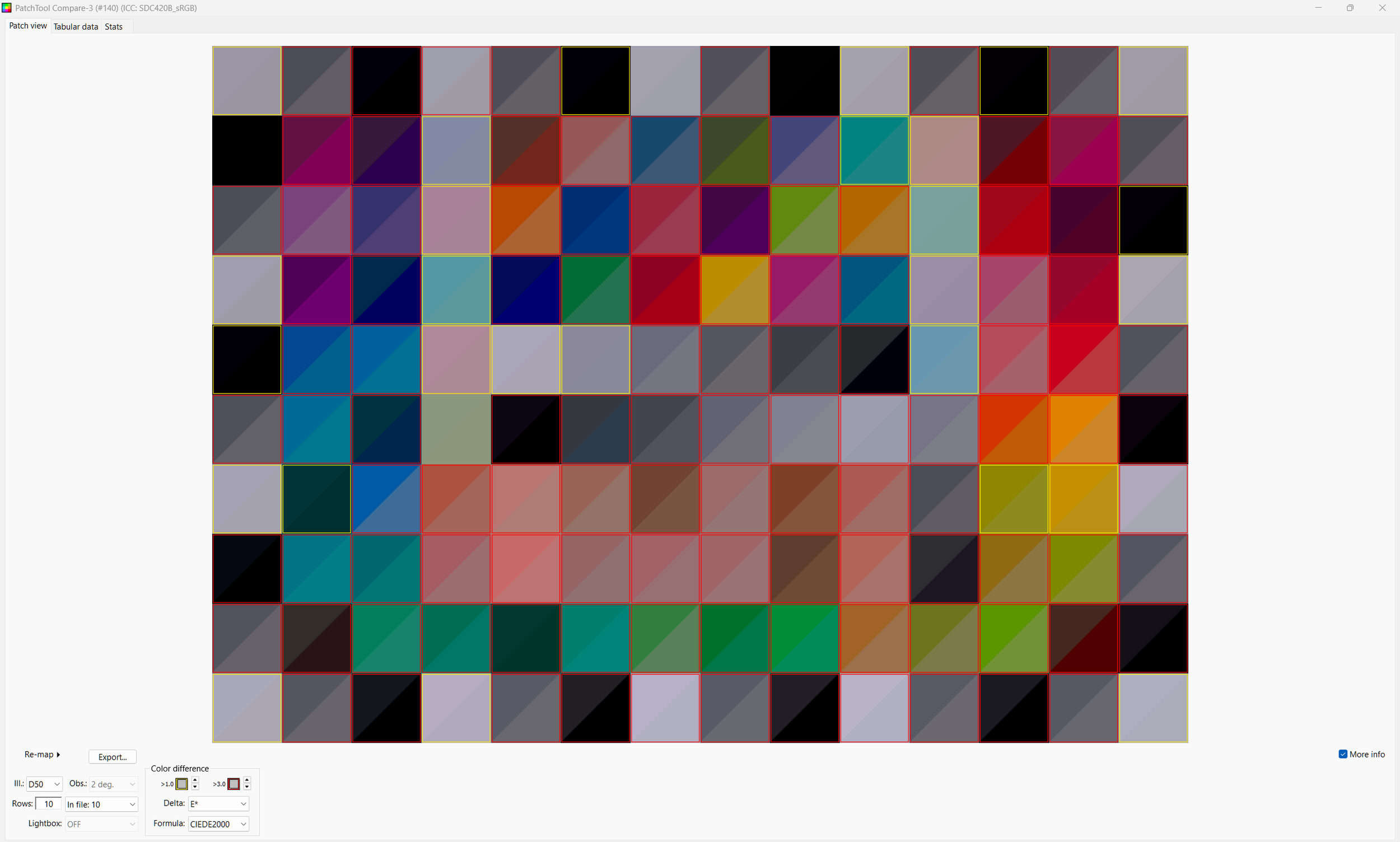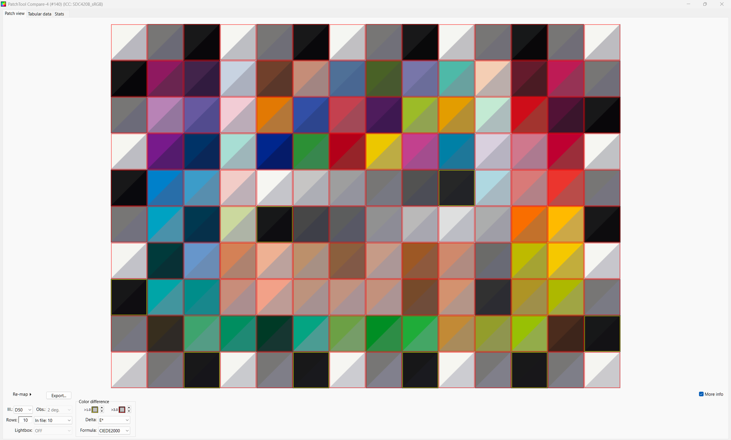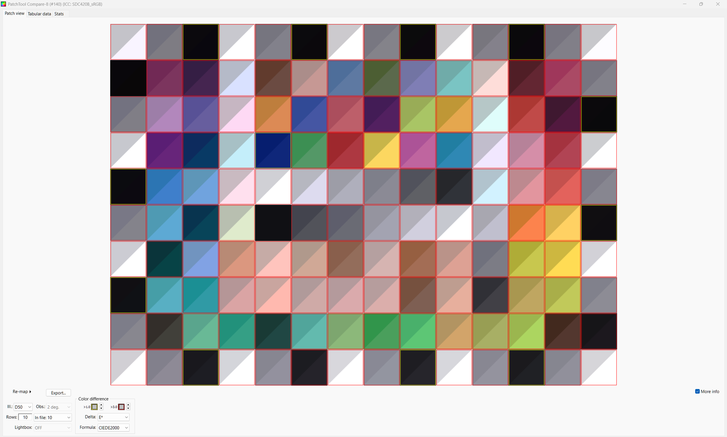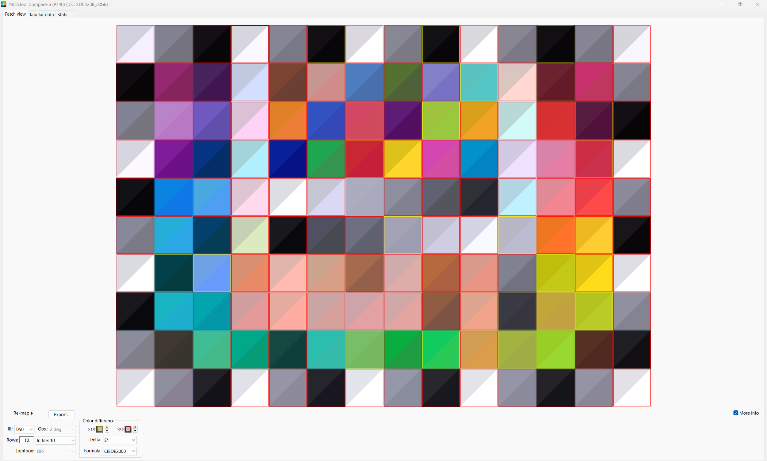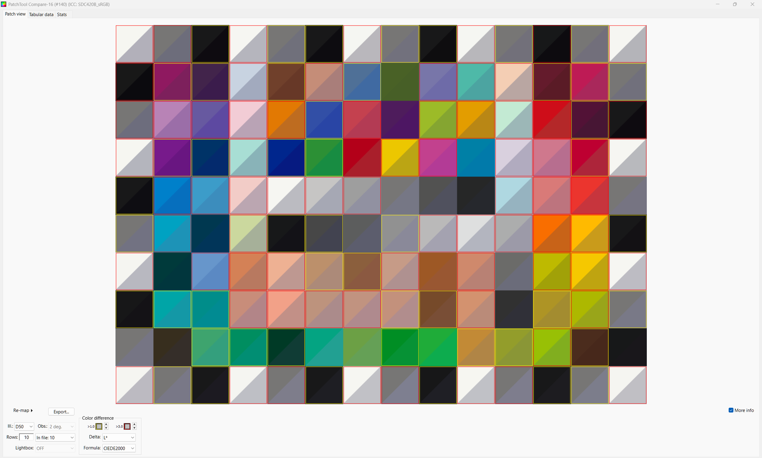 Patch Tool lets you highlight the 140 test patches and it reads the sRGB values out of the 8 bit png from Resolve (Patch Tool refuses 16 bit tiffs). These are compared against the LAB values X-rite published for the Color Checker SG.