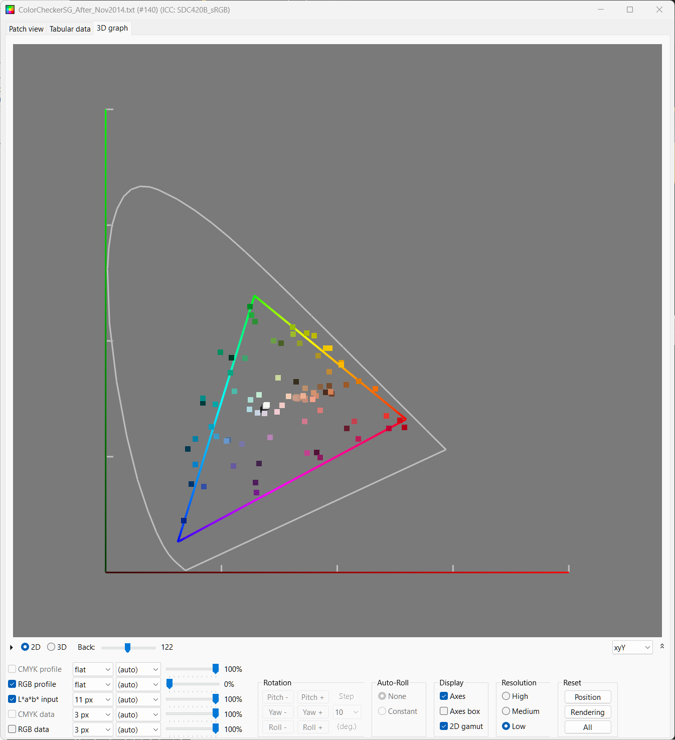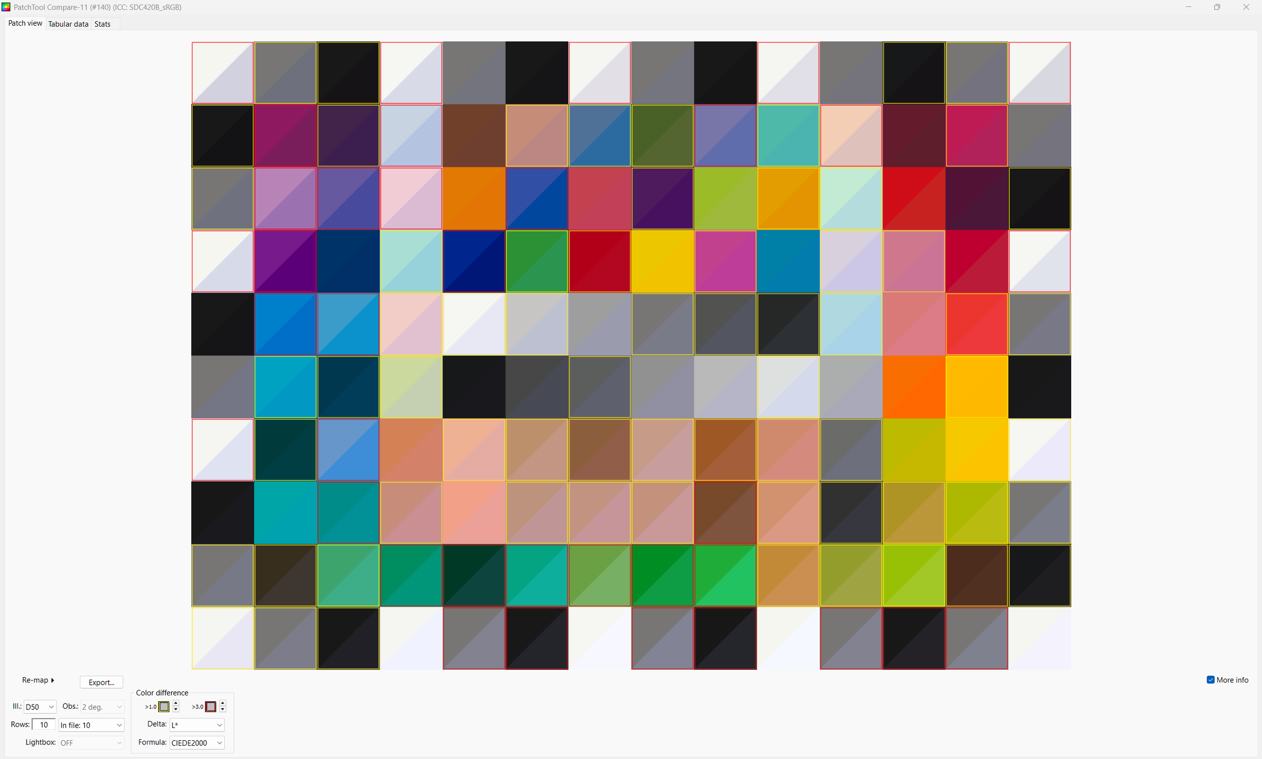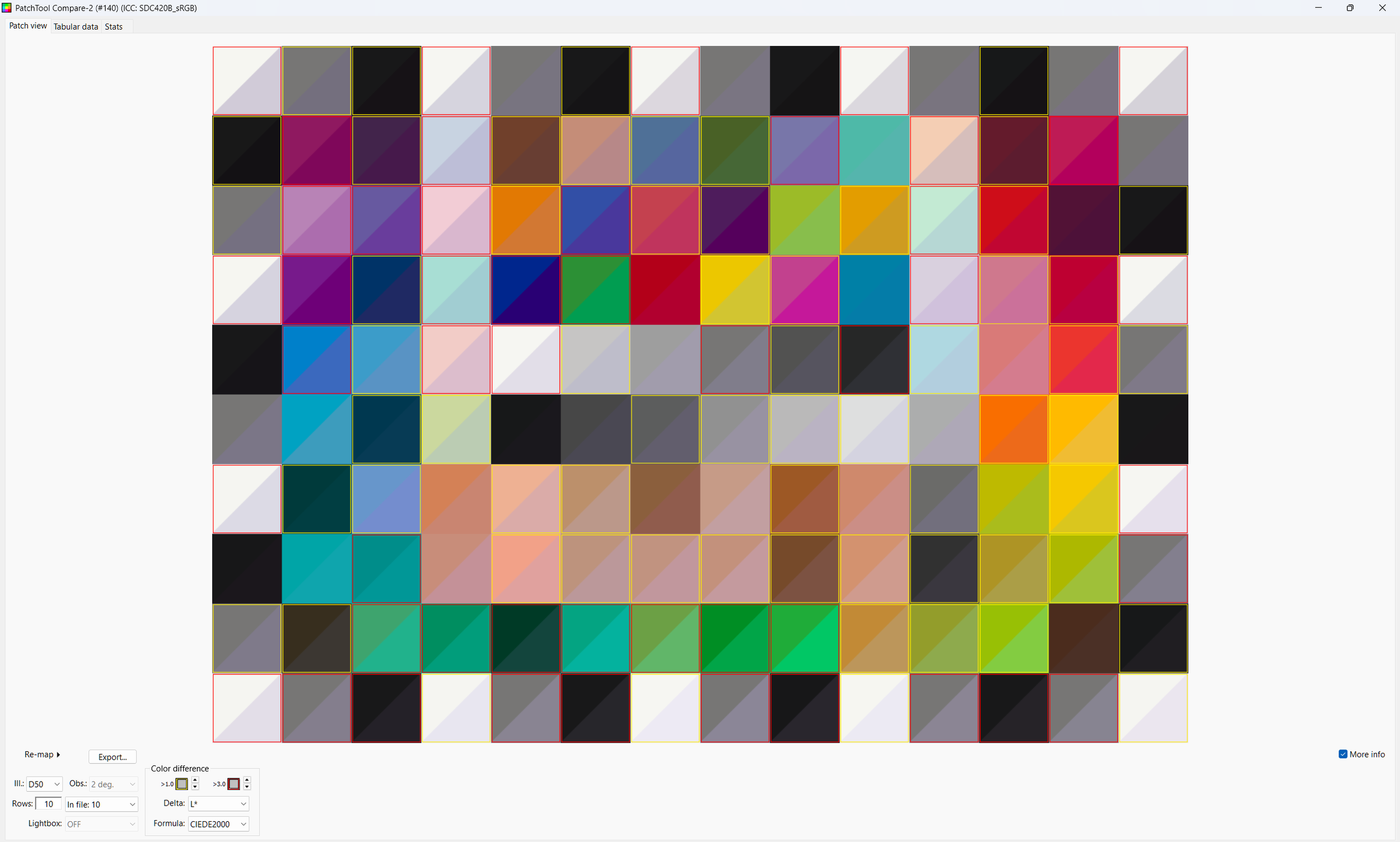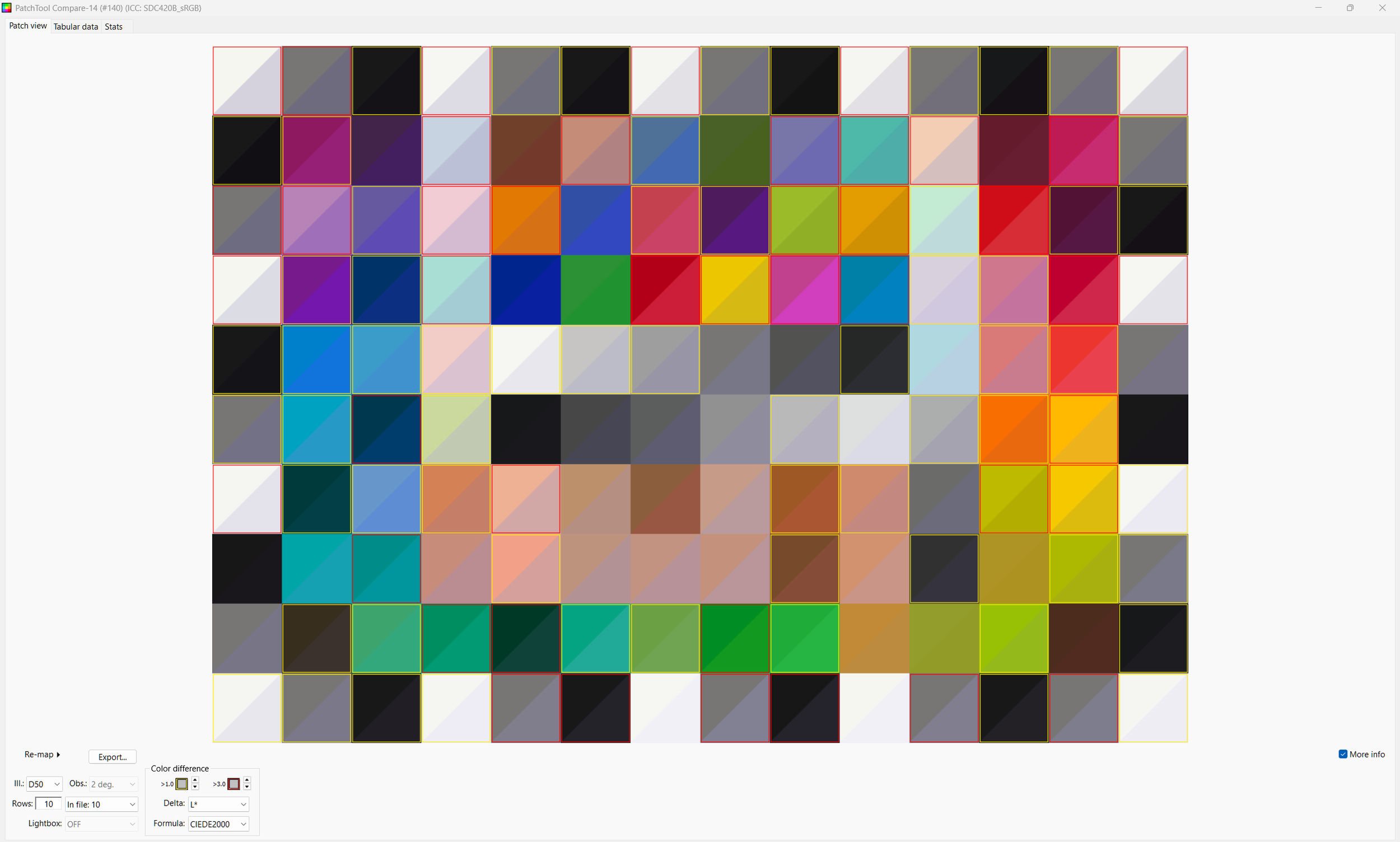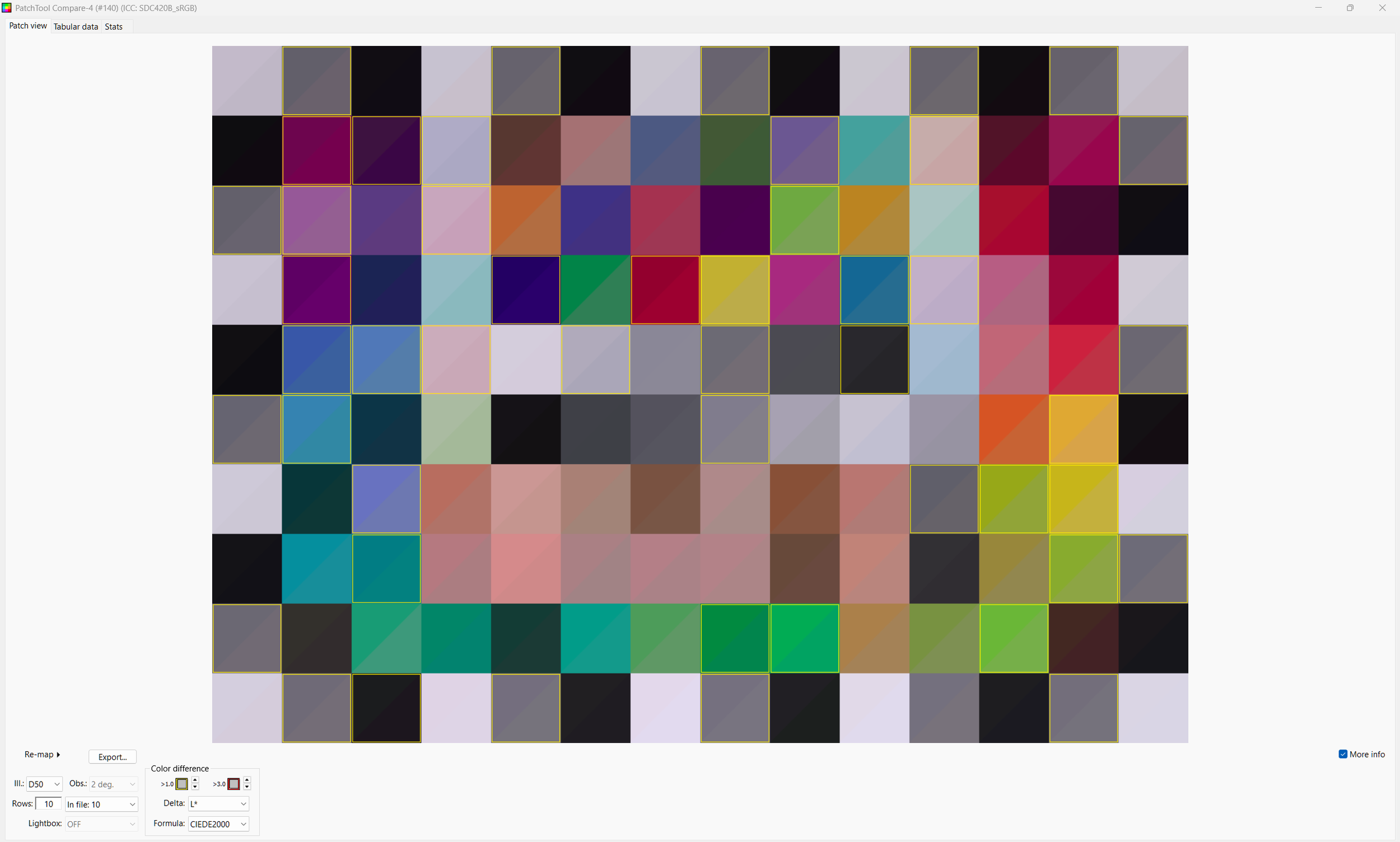 Patch Tool lets you highlight the 140 test patches and it reads the sRGB values out of the 8 bit png from Resolve (Patch Tool refuses 16 bit tiffs). These are compared against the LAB values X-rite published for the Color Checker SG.