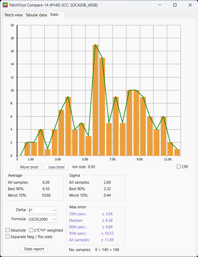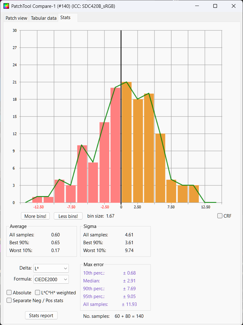 The spread of luminance values is now much closer centered about zero error with half the chips within delta L of 2.64, worlds better than the first two results. Delta E Mean is 6.56 and median 6.38, so about a full point better than the DJI lut.