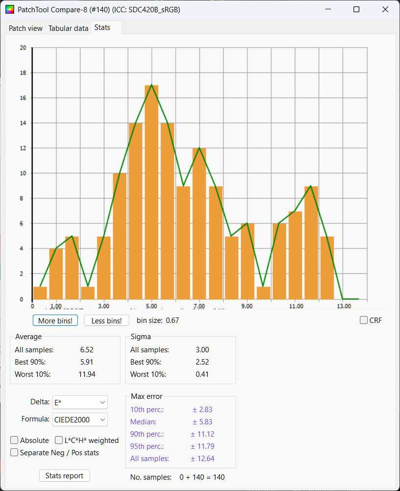 Do note, it is not ideal to be comparing in sRGB, over a dozen of the chips on the CC-SG actually exceed the gammut of sRGB, so it would be impossible for them to produce a perfect score in Patch Tool. But I don't know of a good alternative, patch tool supports ProPhoto, but resolve doesn't, exporting in LAB space produces negative values. So we will have to accept that some chips will show incorrectly poor results due to the sRGB clipping, but this will be a equal problem for all 4 CST methods.